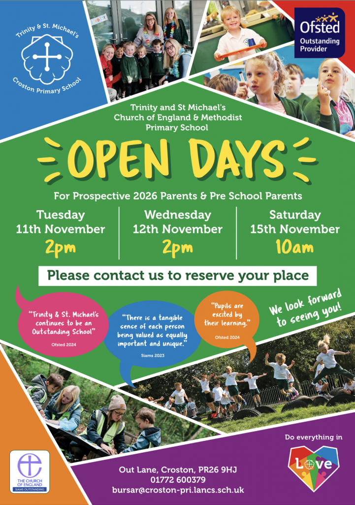 Our Open Morning this year will take place on Saturday 15th November at 9:30am for any parents who wish to see our school and discuss the possibility of their child attending Trinity and St Michael’s.